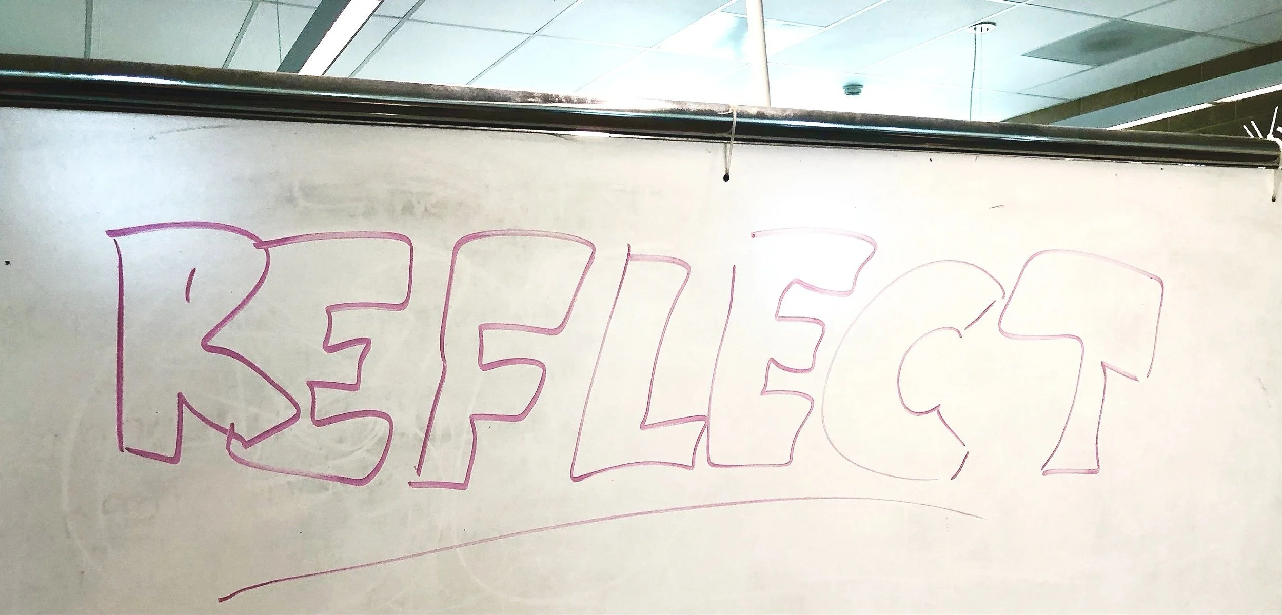 And I look around at this empty room with furniture in the wrong places and things in piles, stacked as the school prepares for summer moves, and the writing still on the boards. And one board has a giant student-written block letter title: REFLECT.